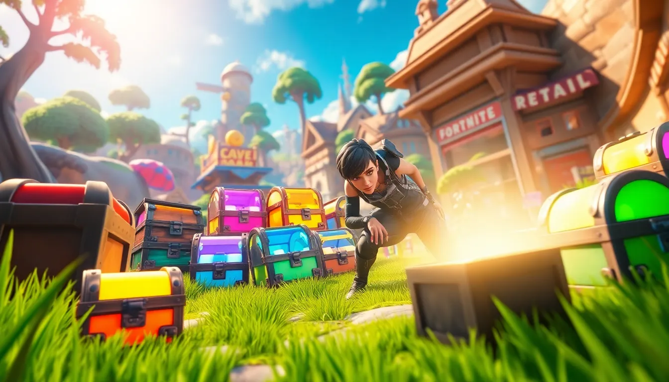 showcasing different types of Fortnite chests in a vibrant landscape.