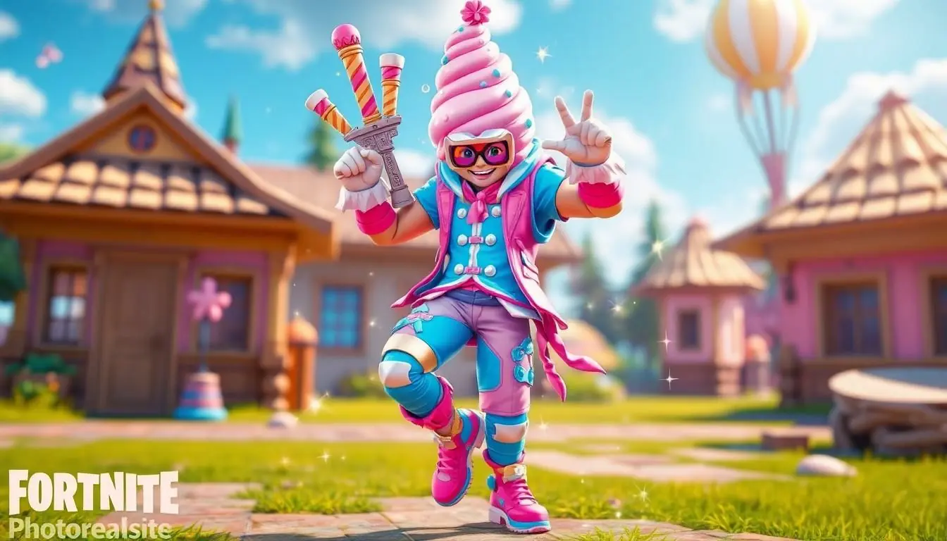 Lil Whip’s design captivates players with its vibrant ice cream theme. This character features a striking color palette, predominantly composed of bright blues, pinks, and whites. His outfit includes whimsical ice cream cones and sprinkles, emphasizing a playful aesthetic that resonates with Fortnite’s fun atmosphere.